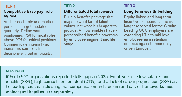 90% of GCC organisations reported skills gaps in 2025. Employers cite low salaries and benefits (38%), high competition for talent (31%), and lack of career progression (28%) as the leading causes — meaning compensation architecture and career frameworks must be designed together, not separately.
