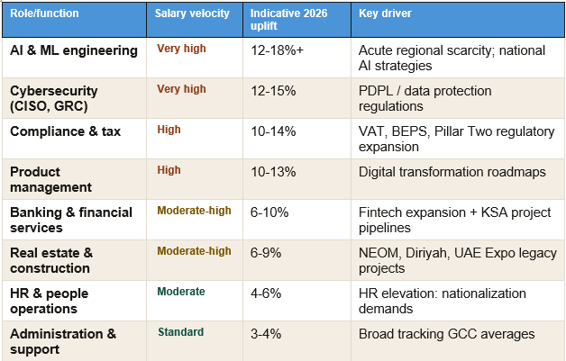 Not all roles are moving at thesame pace. The table below maps the highest-velocity salary segments across theGCC in 2026, so HR leaders can prioritise where real-time benchmarking notannual survey data is non-negotiable.
